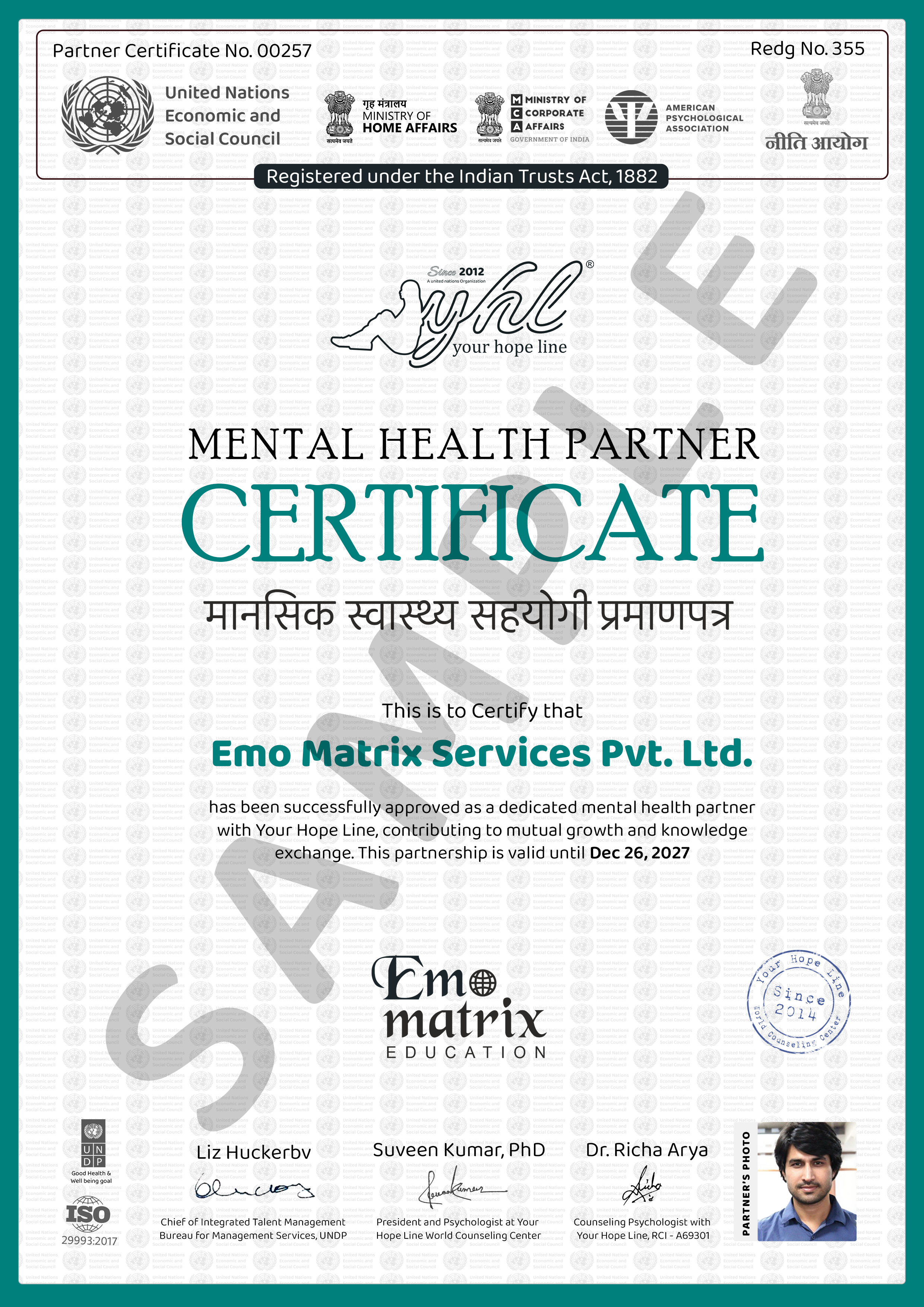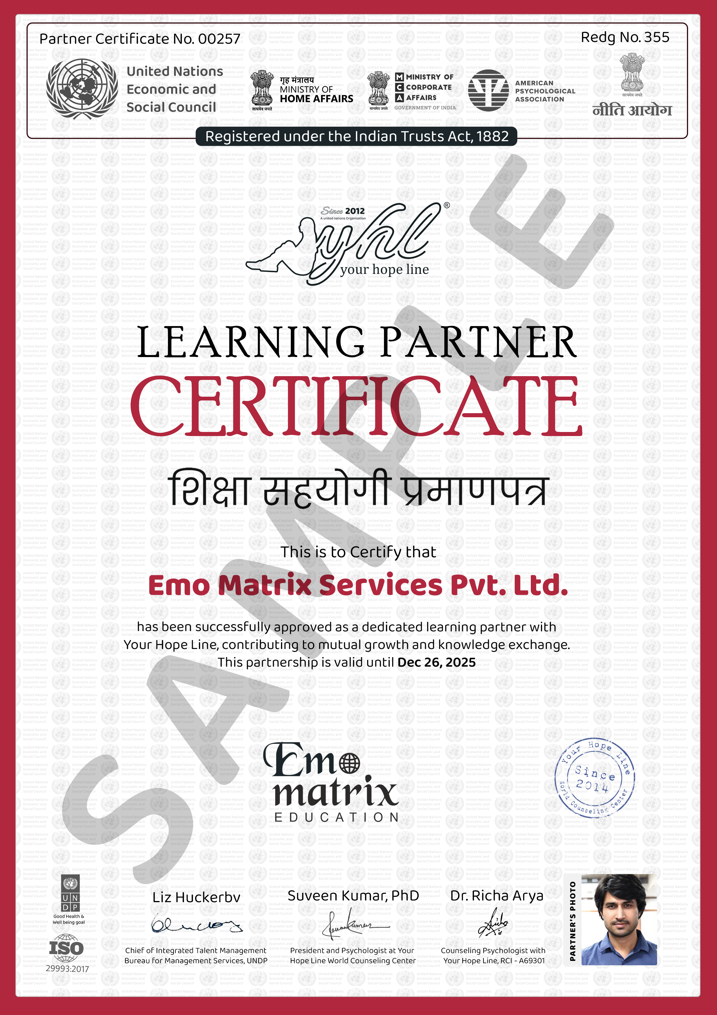Your Hope Line offers the Learning Partner Certificate for institutes, universities, companies, and non-profits that provide mental health education, training, or awareness programs. This certification ensures global recognition, credibility, and professional standards in mental health learning.